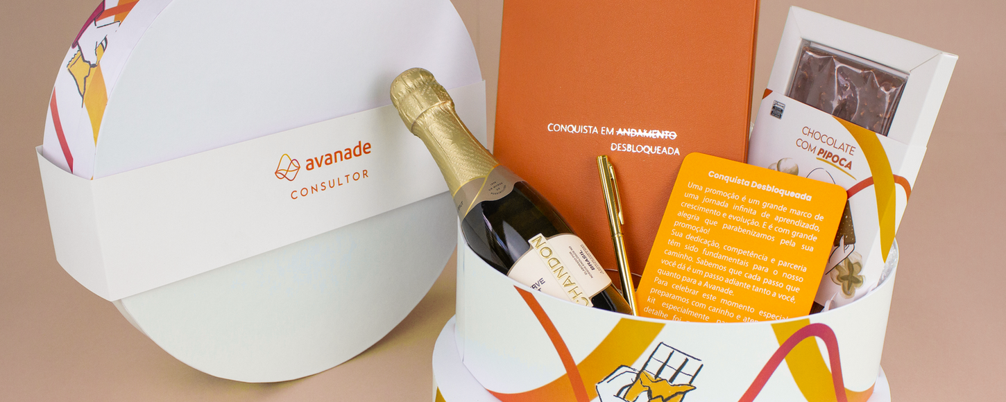 Para celebrar conquistas com modernidade! Este presente exclusivo para os consultores da Avanade traz a inovação de uma caixa redonda, inédita em nossos projetos. Dentro, um caderno revestido em couro com a frase “conquista em andamento desbloqueada”, caneta dourada, mini Chandon e uma barra de chocolate bean to bar feito com pipoca pela Chef Priscyla França, especialista em criar sabores únicos através do cacau.