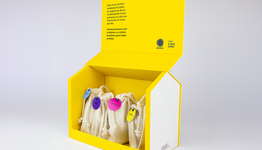 Desenvolvemos este projeto especial para a Record, que marcou presença no evento MNK, onde se reúnem os líderes do marketing brasileiro. O presente simboliza a essência da Record, que está presente na vida dos brasileiros 24 horas por dia. Cada saquinho de algodão representa uma região do Brasil: Sul, Sudeste, Centro-Oeste, Norte e Nordeste. Dentro de cada um, há uma iguaria culinária que reflete a riqueza da região.