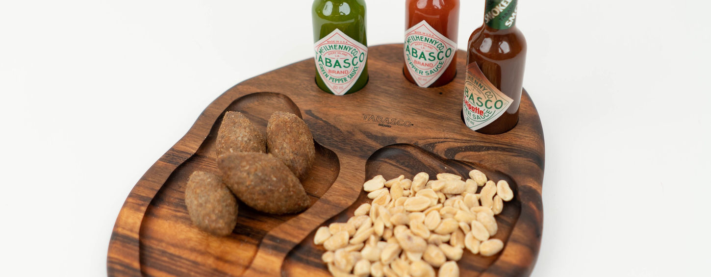 Tábua de frios projetada especialmente para a empresa com linhas orgânicas, trazendo elegância e modernidade, madeira de reflorestamento (Muiricatiara) com rajados e cores únicas da própria madeira. Projeto alinhado com a filosofia da TMC, desenvolver itens que possam ser reutilizados e que tenham uso cotidiano.